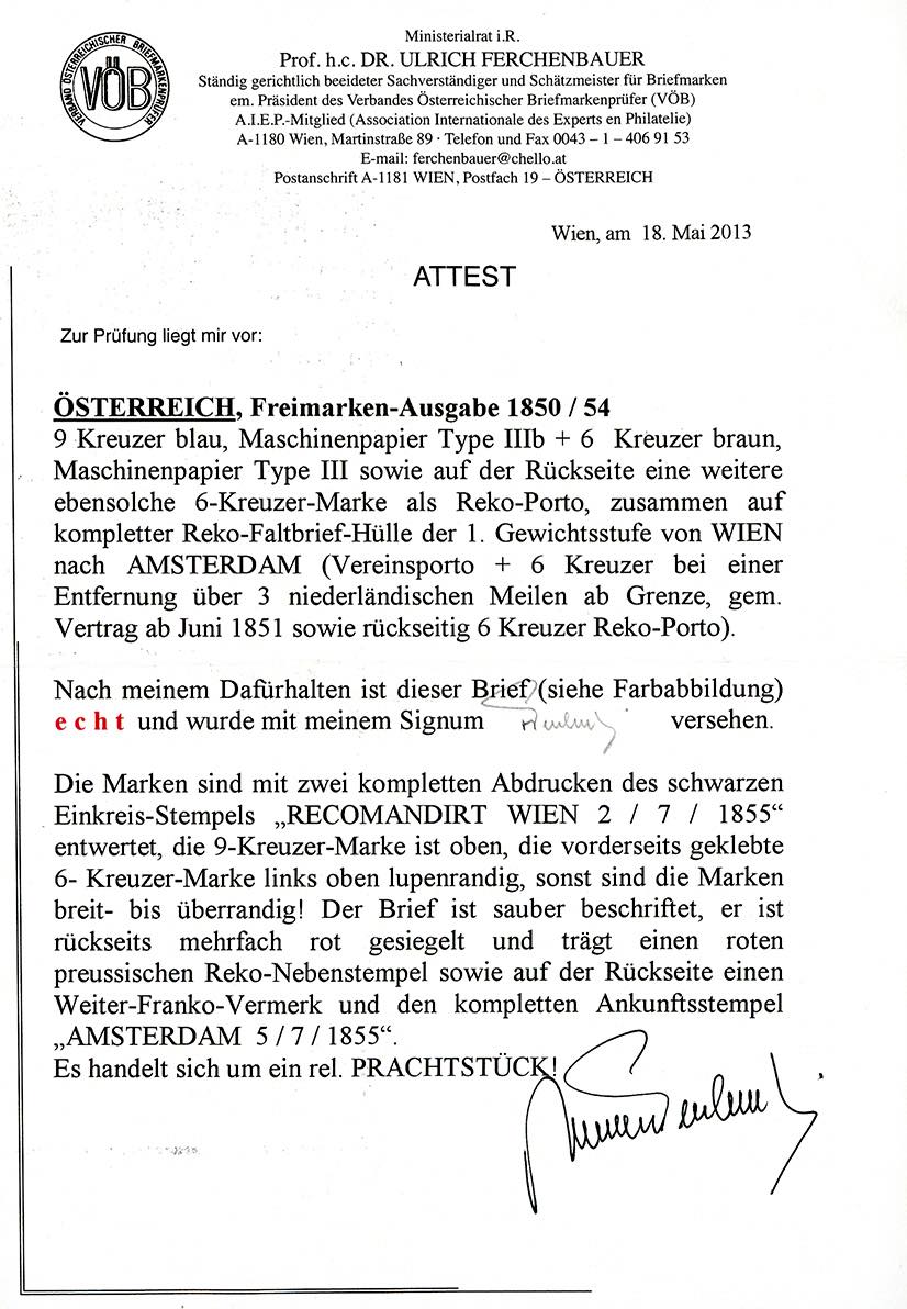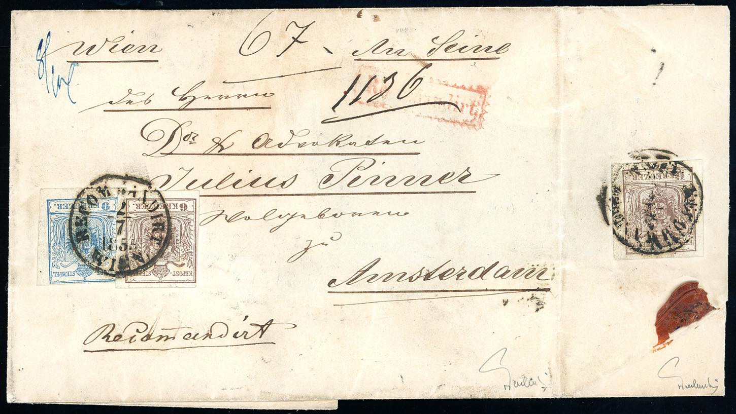 AUSTRIA 1855 - 9 kr. azzurro, 6 kr. bruno, due esemplari, uno al verso per il diritto di raccomandazione, tutti carta a macchina (4/I,5/I), ottimo stato, su lettera raccomandata da Vienna 2/7/1855 ad Amsterdam. Pregevole e di ottimo aspetto. Cert. Ferchenbauer.