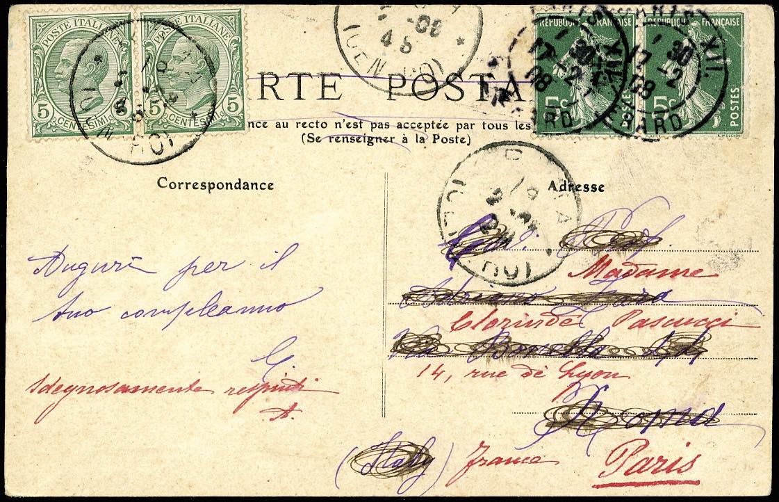 FRANCIA/ITALIA 1908 - Redirected with additional franking. Wishes…disdainfully rejected!