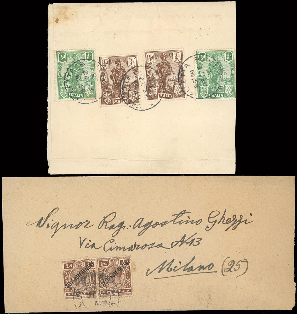 MALTA 1916/1922 - Due fascette affrancate rispettivamente con 1/4 p. soprastampato, coppia (66), e con 1/4 p.e 1/2 p. Allegorie, entrambi due esemplari (84,85), entrambe da La Valletta per Milano.