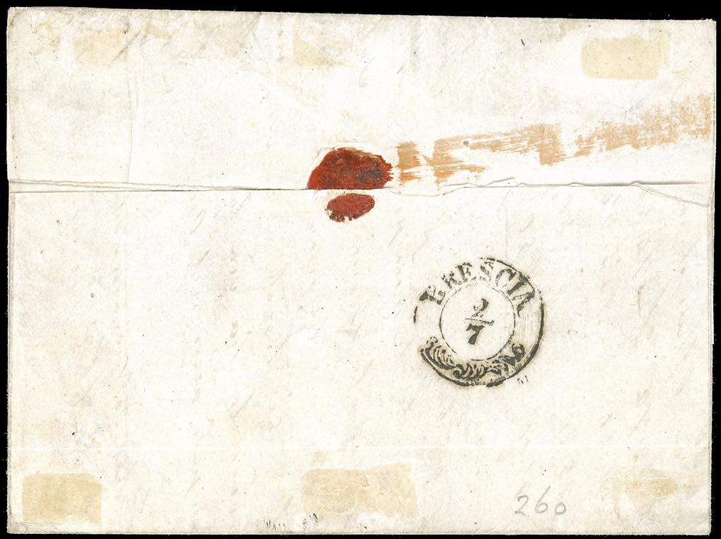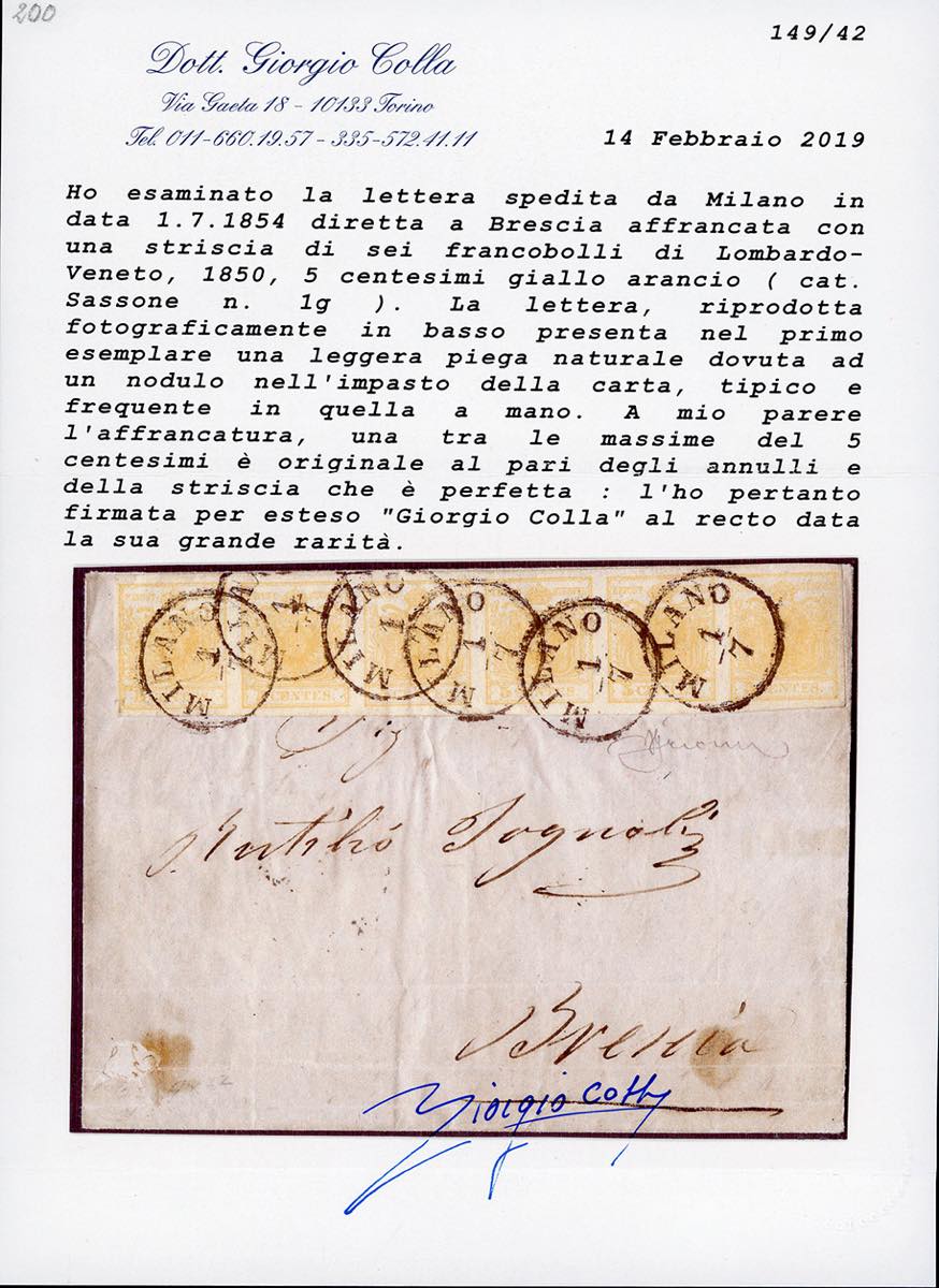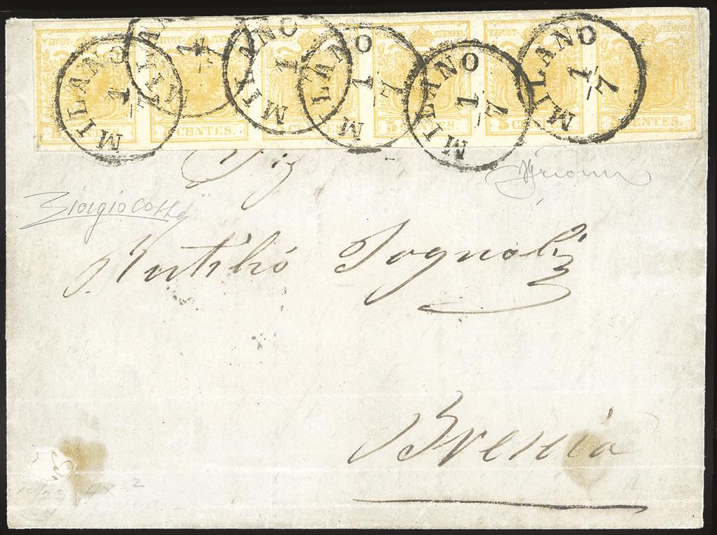 1854 - 5 cent. giallo arancio (1g), striscia orizzontale di sei, perfetta, il primo esemplare con pli d'accordeon, su lettera da Milano 1/7/1854 a Brescia. Affrancatura estremamente rara "una tra le massime del 5 centesimi" secondo il cert. Colla. Firmata Grioni.