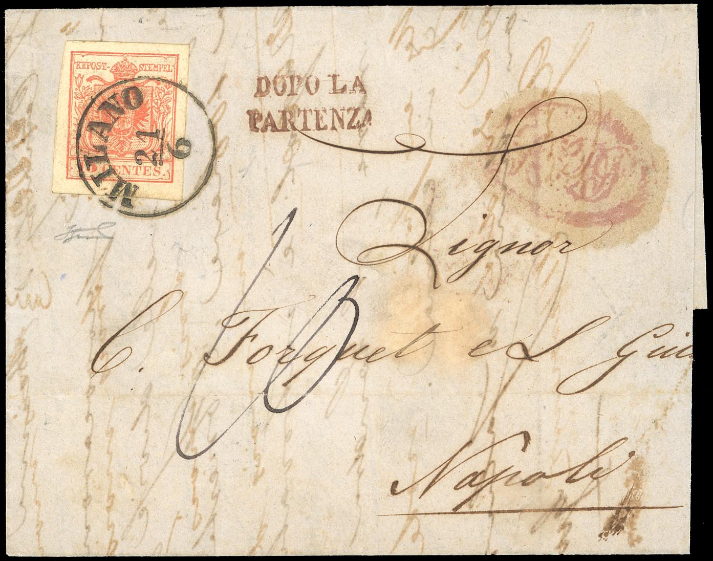 1855 - 15 cent. rosso vermiglio, carta a macchina (20), perfetto, su lettera da Milano 21/6/1855 a Napoli, bollo in rosso "dopo la partenza", tassata 10 grana. Non comune destinazione. Ferrario. Ex coll. Imperato.