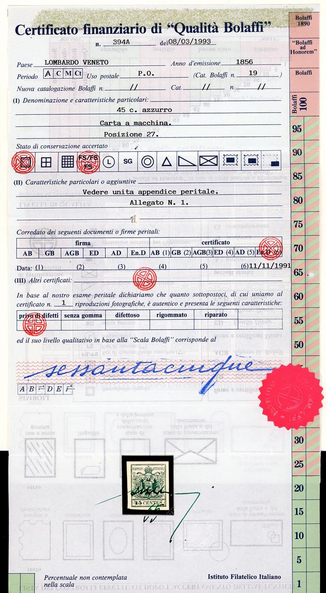 1856 - 45 cent. azzurro vivo, carta a macchina, pos. 27 (22a), nuovo, gomma originale integra, perfetto e con grandi margini. Freschezza eccezionale, splendido e molto raro di questa qualità. Apparteneva al blocco di 49 esemplari detto "Blauer Kaiser", successivamente separato. Cert. E.Diena e Finanziario Bolaffi.