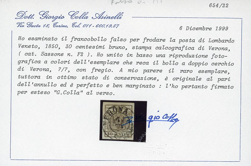 FALSI PER POSTA 1853 - 30 cent. bruno, falso per posta di Verona (F2), perfetto e ben marginato, usato a Verona 7/7. Splendido e raro. ... Leggi tutto