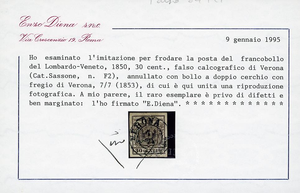 FALSI PER POSTA 1853 - 30 cent. bruno, falso per posta di Verona (F2), perfetto e ben marginato, usato a Verona 7/7. Splendido e raro. Cert. E.Diena e Colla.