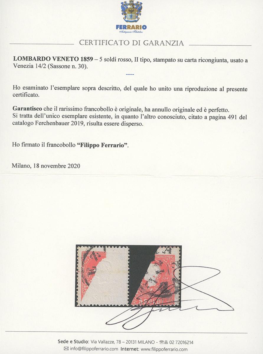 1859 - 5 soldi rosso, II tipo (30), stampato su carta ricongiunta, perfetto, usato a Venezia 14/2. Eccezionale varietà, della quale si conosce un solo altro esemplare, ma difettoso, riprodotto nel catalogo Ferchenbauer a pag. 498, attualmente disperso. Rarità della seconda emissione. Cert. Avi e Ferrario.