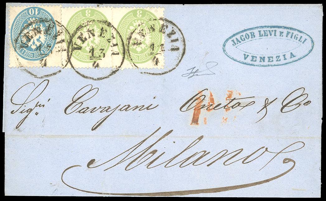 1864 - 3 soldi verde, due esemplari, 10 soldi azzurro, dent. 14 (37,39), perfetti, su lettera da Venezia 13/4/1864 a Milano. Bella. ... Leggi tutto