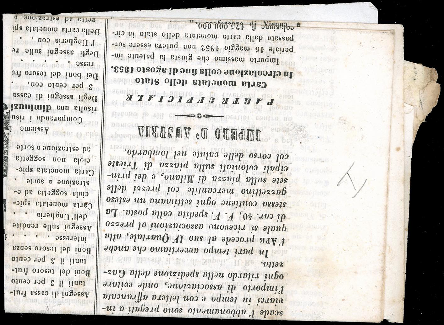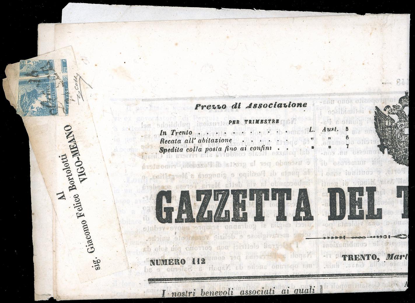 1853 - 3 cent. Mercurio azzurro, I tipo (3), tagliato irregolarmente in frode postale, per ottenere 11 francobolli dai 10 della fila orizzontale, su giornale "La Gazzetta del Tirolo Italiano" del 20/9/1853 da Lavis 24/9 a Vigo-Meano. Frode postale molto rara nell'Impero Austriaco. Dettagliato cert. Colla.