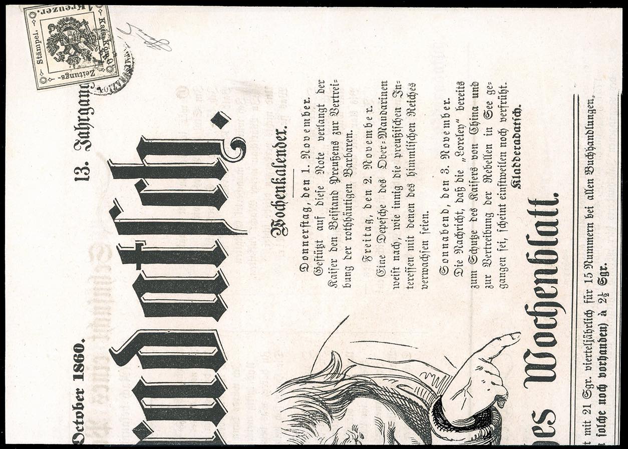 1860 - 1 kr. nero (2), corto in basso, usato in arrivo a Verona su fresca testata del giornale Kladderadatsch del 28/10/1860. Occasione. Ferrario.