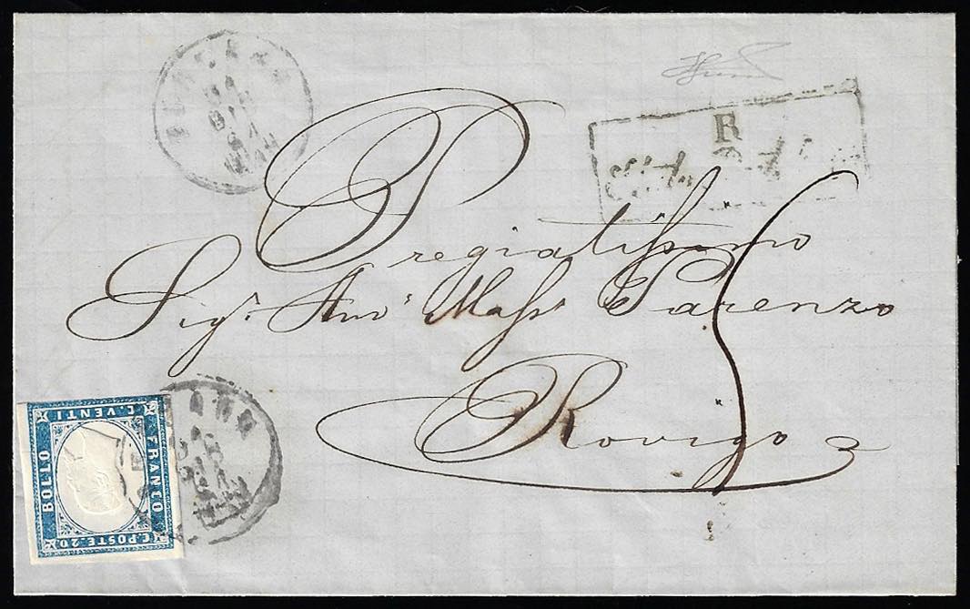 R-STATO PONTIFICIO - 20 cent. celeste (15Da), a filo in basso, su sovracoperta di lettera da Ferrara 31/12/1861 a Rovigo, tassata. Rarissimo bollo di ingresso, non catalogato dal cat. Sassone. Ferrario.
