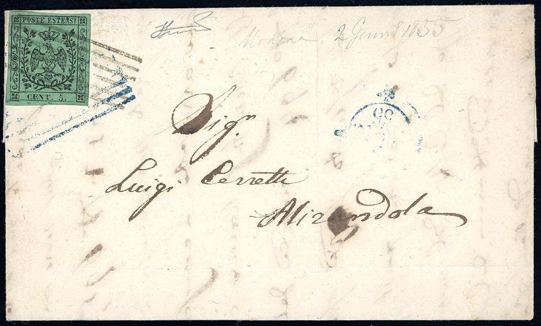 1855 - 5 cent. verde, punto dopo le cifre (7), perfetto, isolato su fresca lettera da Modena 2/1/1855 a La Mirandola. Il francobollo fu annullato due volte, sia con il bollo nero che con quello azzurro a sei sbarre di Modena. Spettacolare ed UNICO CASO NOTO, finora inedita e non catalogata. Cert. Ferrario.