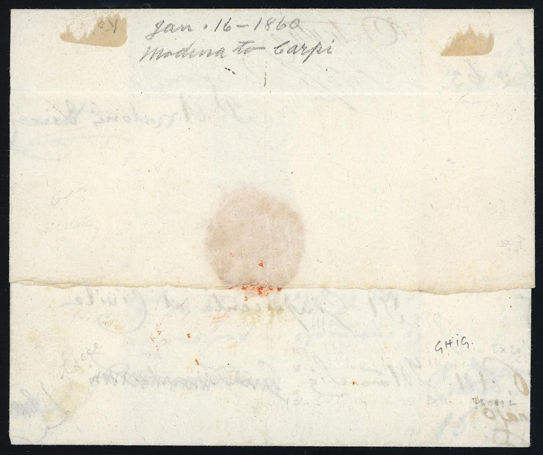 1860 - 5 cent. verde, lieve grinza verticale, 20 cent. ardesia violaceo, due esemplari, uno perfetto e ben marginato, l'altro leggermente intaccato in basso (12,15), su fresca lettera raccomandata da Modena 13/1/1860 a Carpi. Em.Diena e cert. Sorani.