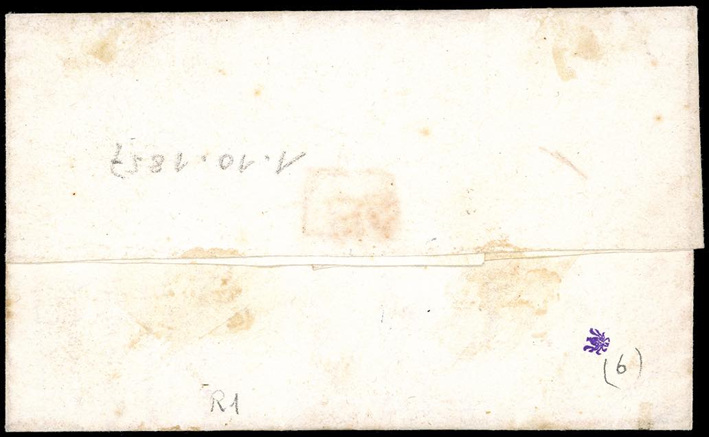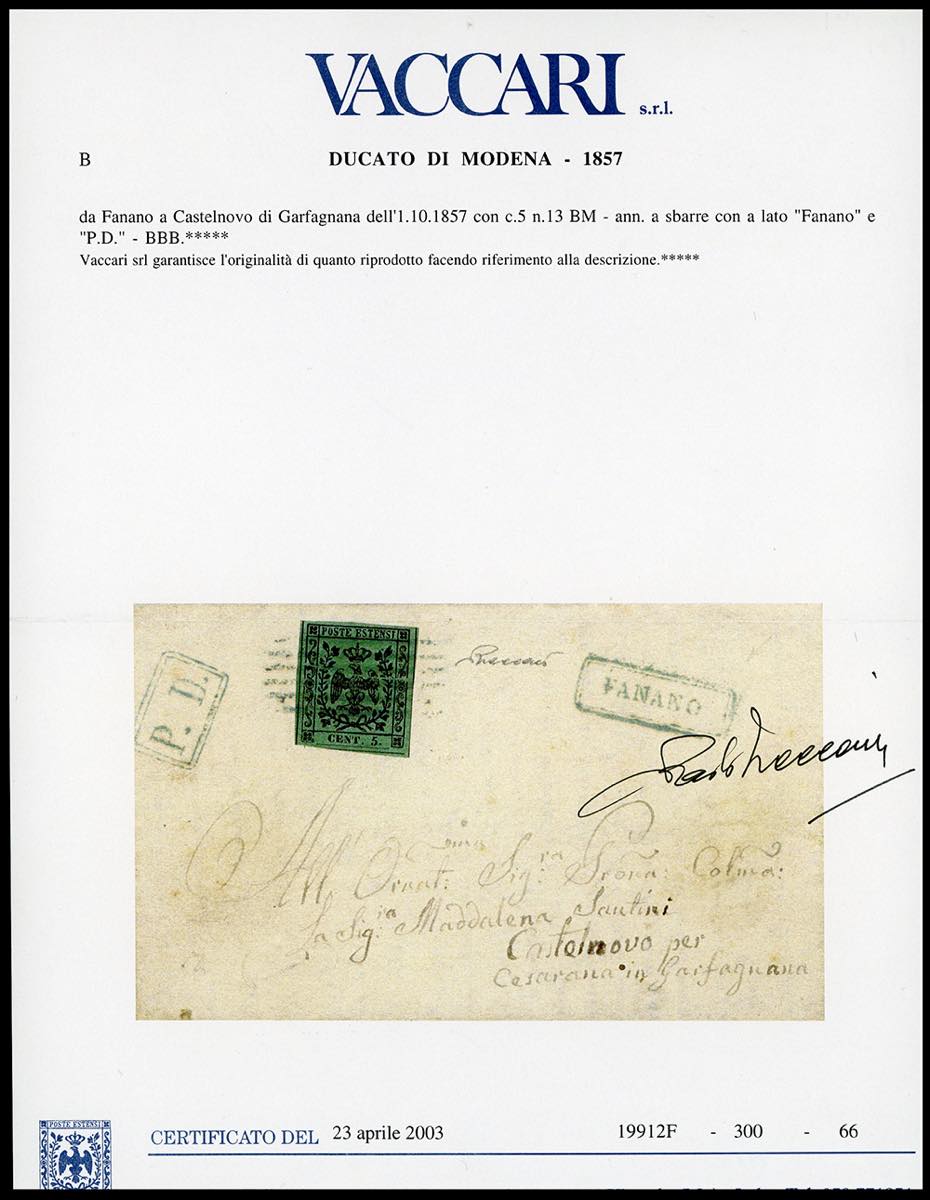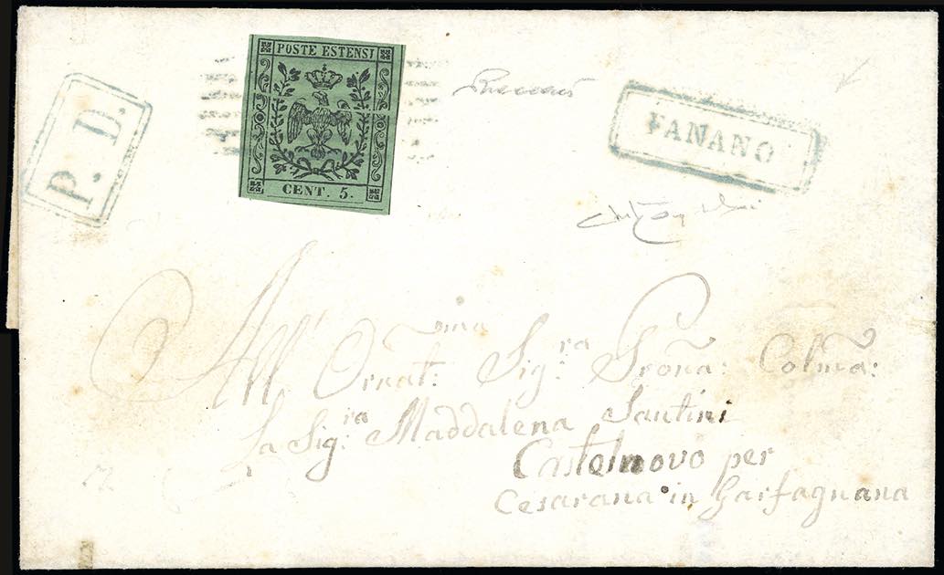 FANANO, 6 sbarre + cartella azzurri punti R1 - 5 cent. verde, punto dopo la cifra (7), bella varietà di clichè, perfetto, su lettera del 1/10/1857 a Castelnovo Garfagnana. Rara. Raybaudi, cert. Vaccari.