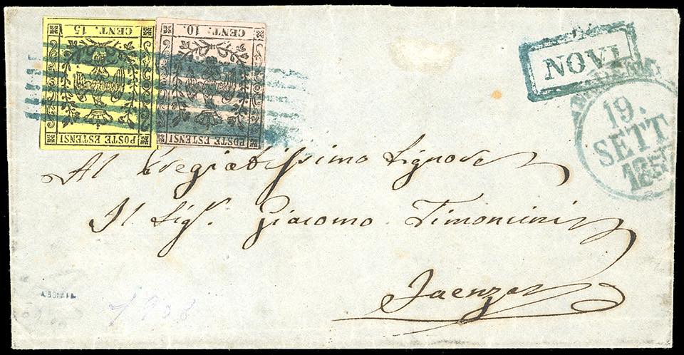 NOVI, 6 sbarre + cartella in azzurro punti 10 - 10 cent., sfiorato a sinistra e 15 cent., perfetto (3,9), su lettera del 19/9/1857 per Faenza.