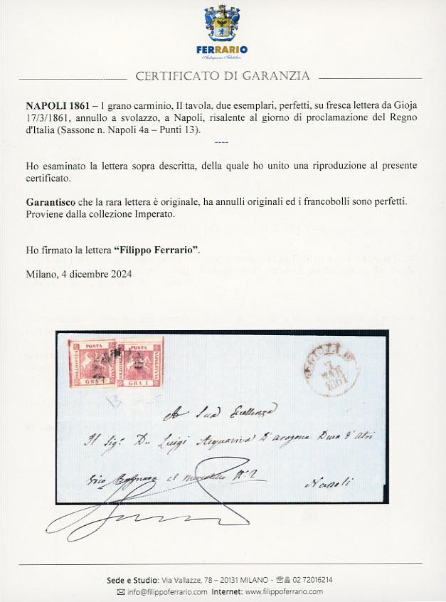 1861 - 1 grano carminio, II tavola (Napoli 4a), due esemplari, perfetti, su fresca lettera da Gioja 17/3/1861, annullo a svolazzo (punti 13), a Napoli. Splendida e rarissima lettera risalente al giorno di proclamazione del Regno d'Italia. Da esposizione! E.Diena, cert. Ferrario. Ex coll. Imperato.