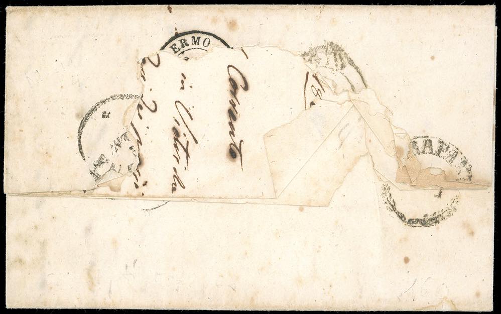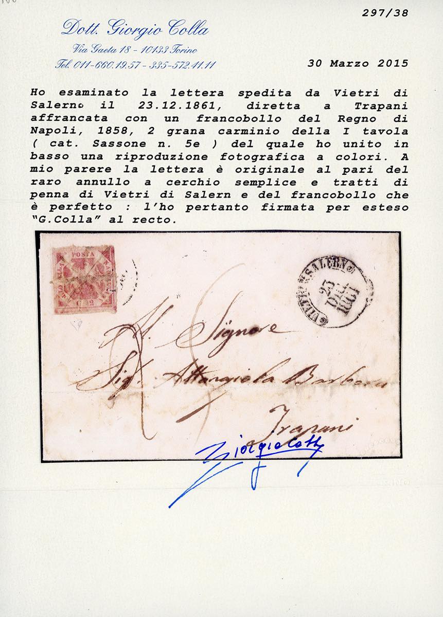 1861 - 2 grana carminio, I tavola (5e), su lettera da Vietri di Salerno 23/12/1861 a Trapani. Il francobollo, annullato solo leggermente dal datario di partenza, presenta quattro segni di penna incrociati, apposti probabilmente per demonetizzarlo in quanto fuori validità postale e la lettera venne tassata inizialmente 5 grana, successivamente cassati e corretti in 2 grana. Rara e molto interessante. Cert. E.Diena e Colla.