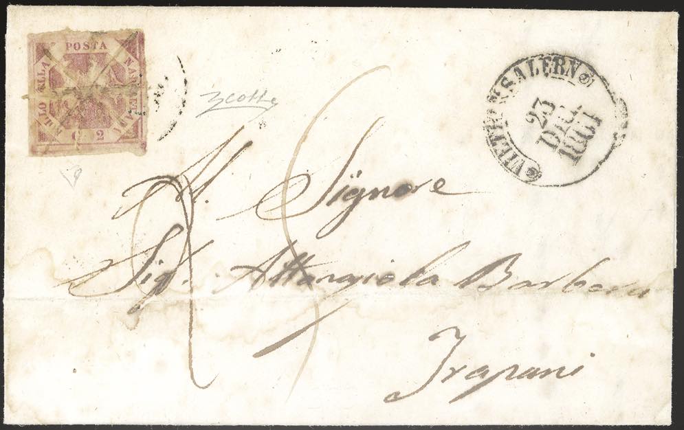 1861 - 2 grana carminio, I tavola (5e), su lettera da Vietri di Salerno 23/12/1861 a Trapani. Il francobollo, annullato solo leggermente ... Leggi tutto