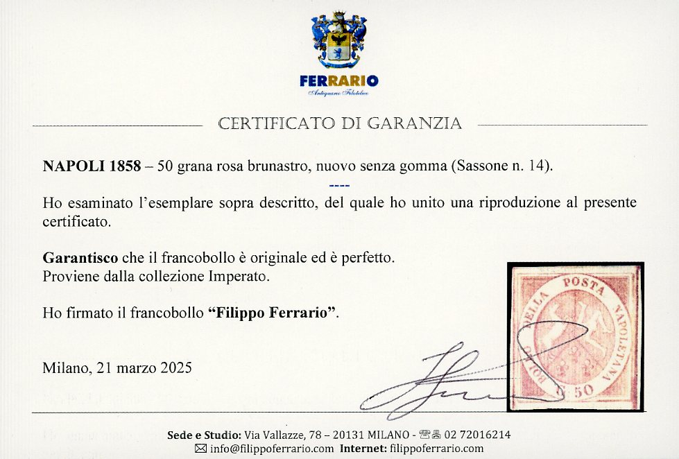 1858 - 50 grana rosa brunastro (14), nuovo senza gomma, perfetto e con grandi margini. Molto fresco, qualità lusso. A.Diena, Raybaudi, cert. Ferrario. Ex coll. Imperato.
