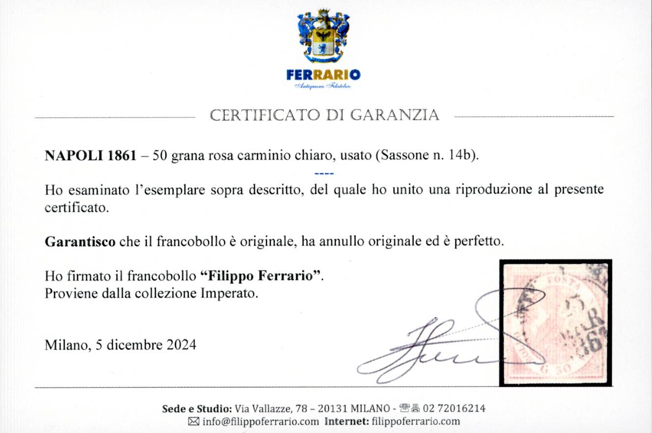 1861 - 50 grana rosa carminio chiaro (14b), usato, perfetto. Bellissimo. Enzo Diena per esteso, cert. Ferrario. Ex coll. Imperato.