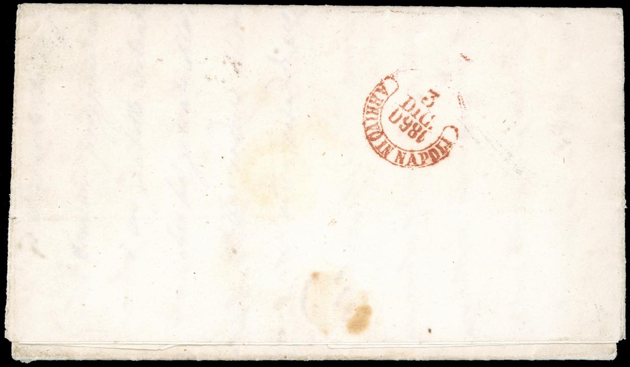 MOLA DI BARI, svolazzo e cerchio, punti 13 - 2 grana rosa carminio, I tavola (5d), perfetto, bordo di foglio, su fresca lettera del 30/11/1860 a Napoli, durante la Luogotenenza di Carlo Farini. Bella e rara. Vaccari, cert. Ferrario. Ex coll. Imperato.