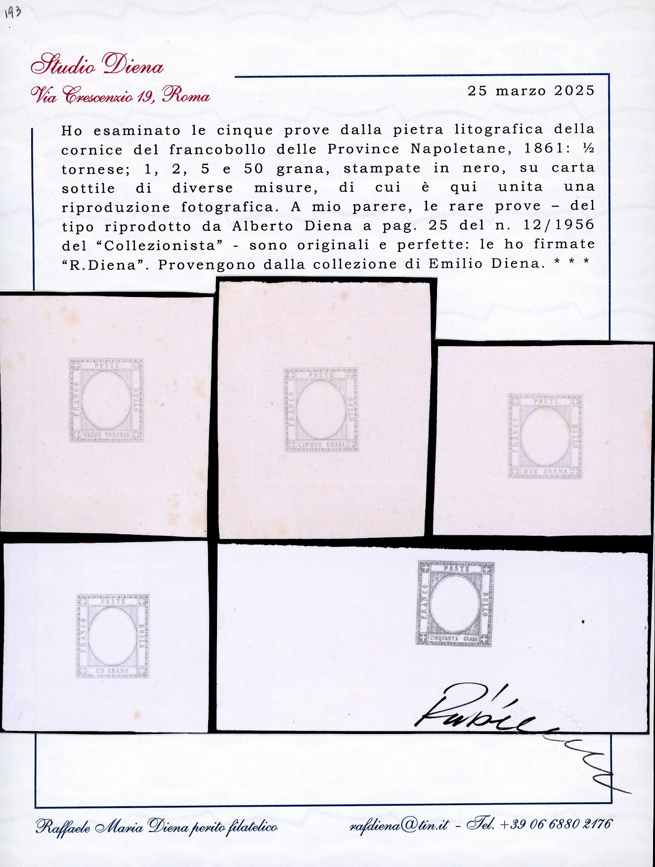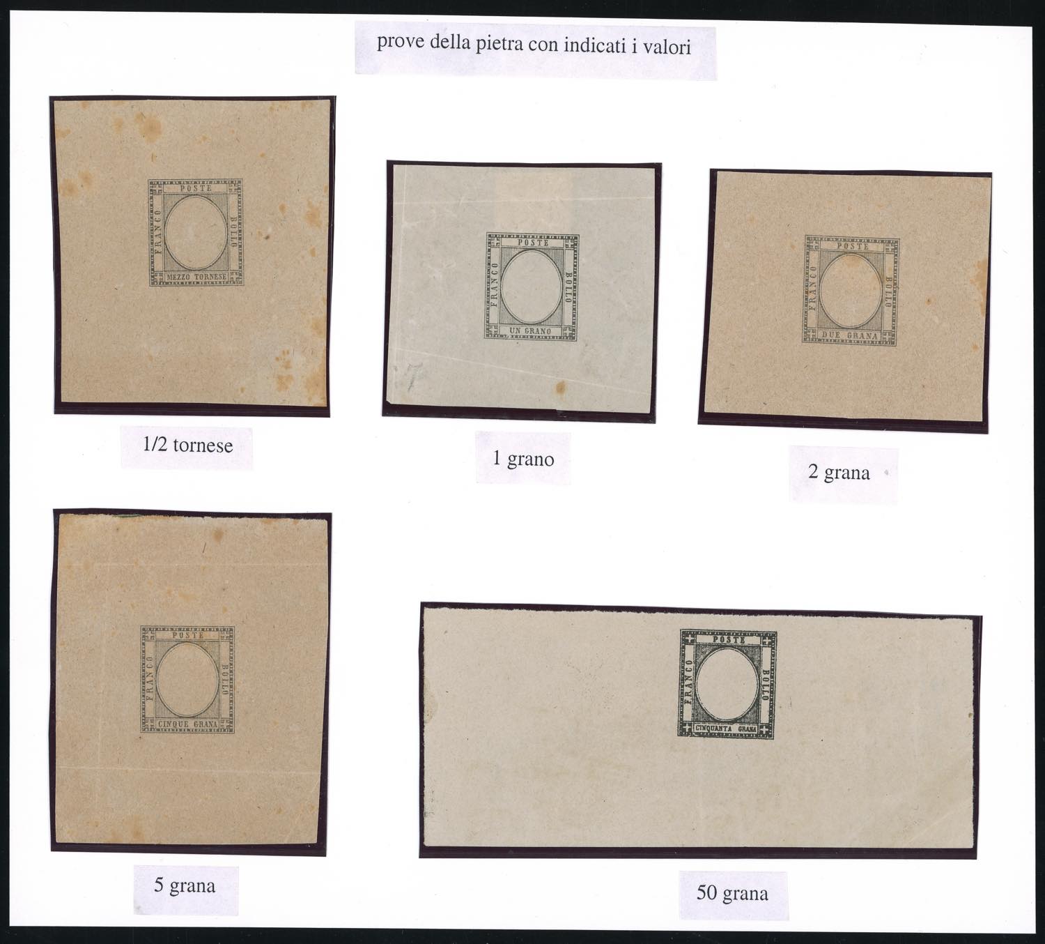 1861 - Prove della pietra in nero con indicazione del valore, cinque esemplari su foglietti di carta sottile, di differenti misure, dei francoblli da 1/2 tornese, 1 grano, 2 grana, 5 grana e 50 grana, senza effigie, senza gomma, ottimo stato. Molto rare. Cert. Diena. Ex coll. Emilio Diena.