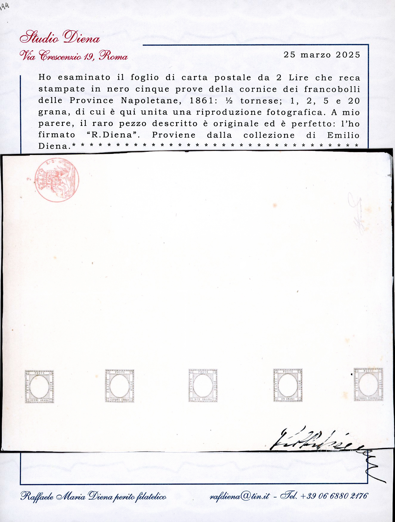 1861 - Prove della pietra in nero con indicazione del valore, cinque esemplari su foglio di carta bollata da lire 2, cm. 19,5 x 25,5, dei francobolli da 1/2 tornese, 1 grano, 2 grana, 5 grana e 20 grana, senza effigie, senza gomma, perfette. Insieme probabilmente unico. Ferrario. Cert. Diena. Ex coll. Emilio Diena.