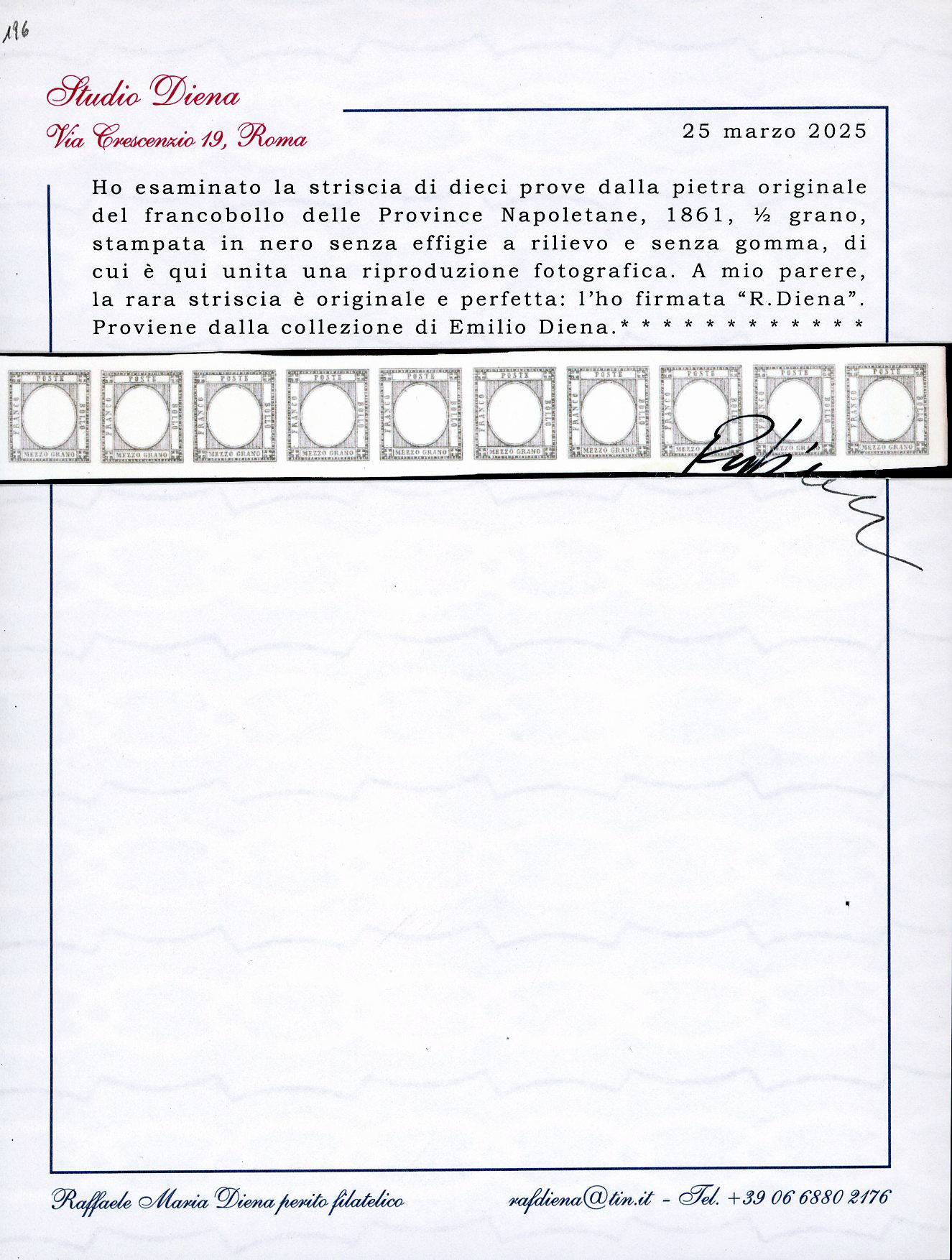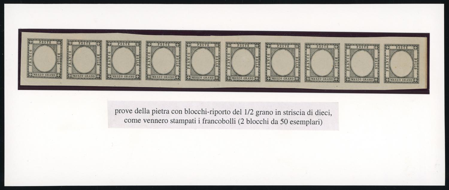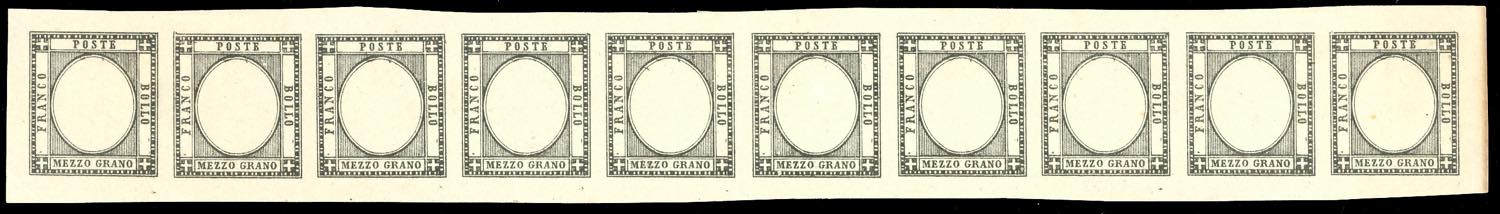 1861 - Prova della pietra in nero con blocchi-riporto del 1/2 grano, striscia orizzontale di 10 esemplari (come vennero stampati i francobolli prima di essere divisi in fogli di 50 esemplari), senza effigie, senza gomma, perfetta e di ottima qualità. Splendida ed estremamente rara. Cert. Diena. Ex coll. Emilio Diena.