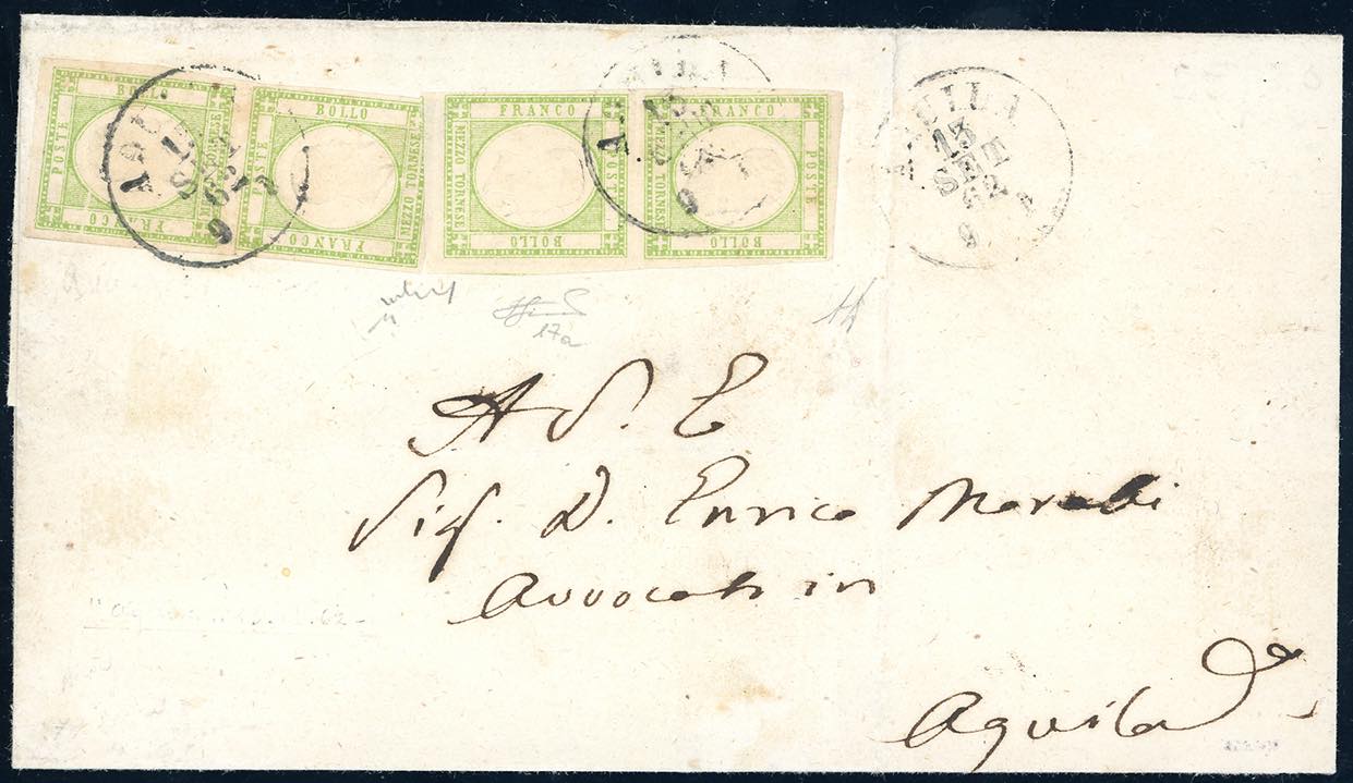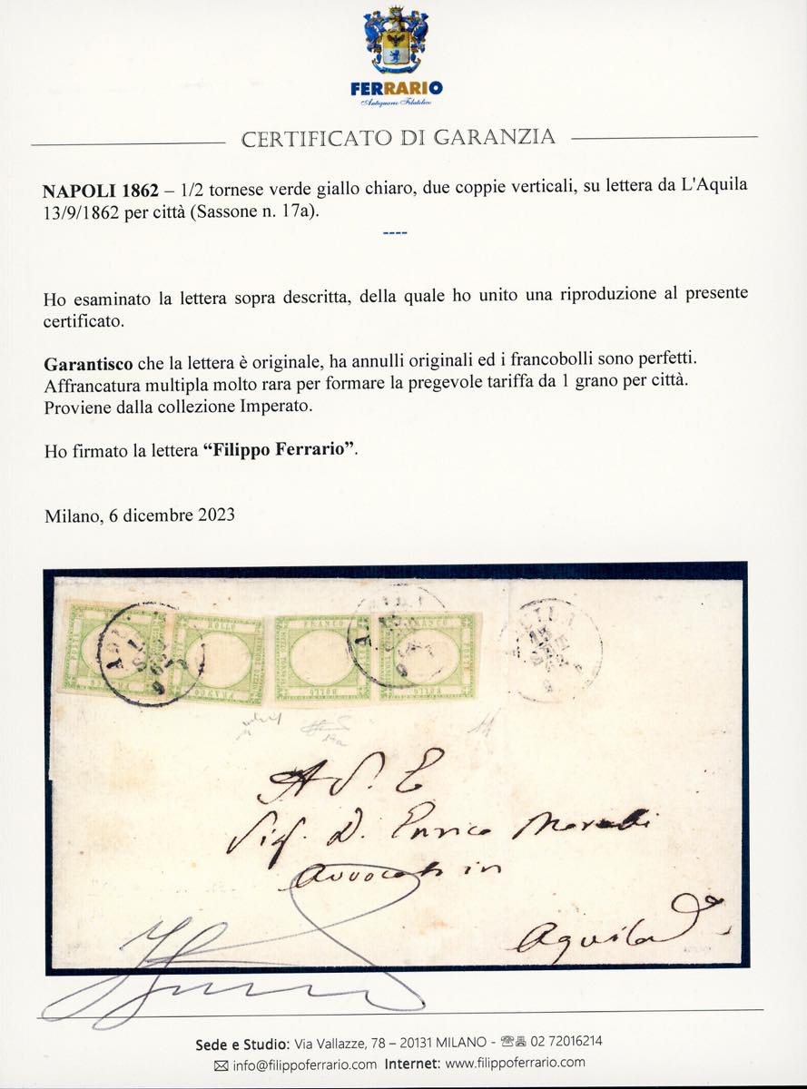 1862 - 1/2 tornese verde giallo chiaro (17a), due coppie verticali, perfette, su lettera da L'Aquila 13/9/1862 per città. Affrancatura multipla molto rara per formare la pregevole tariffa da 1 grano per città. A.Diena, Chiavarello, cert. Ferrario. Ex coll. Imperato.