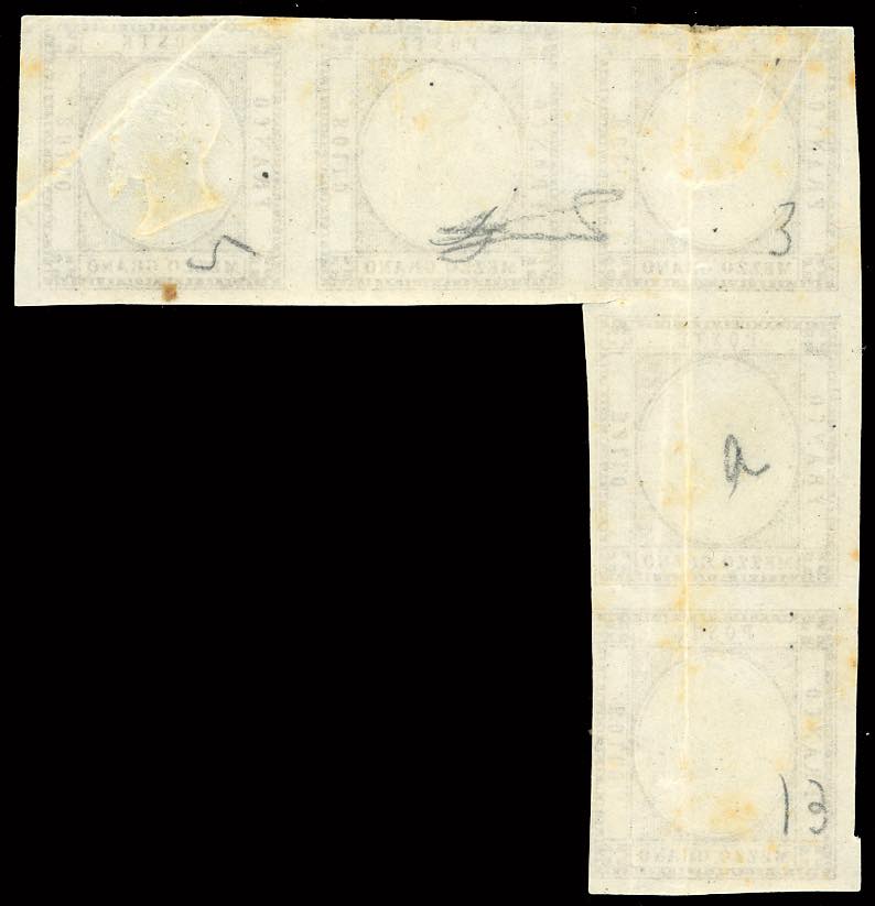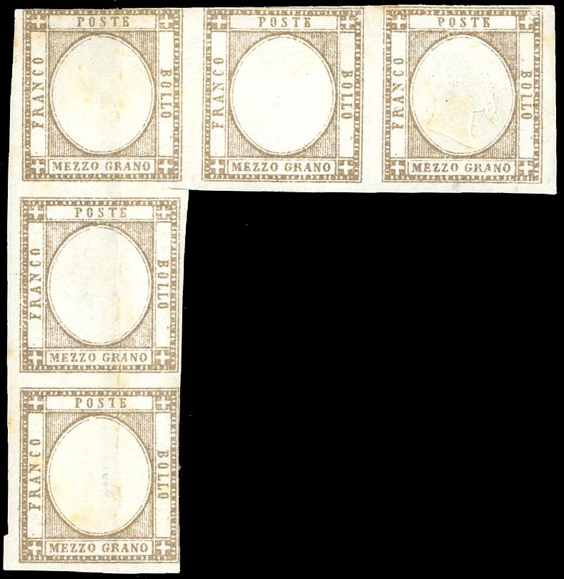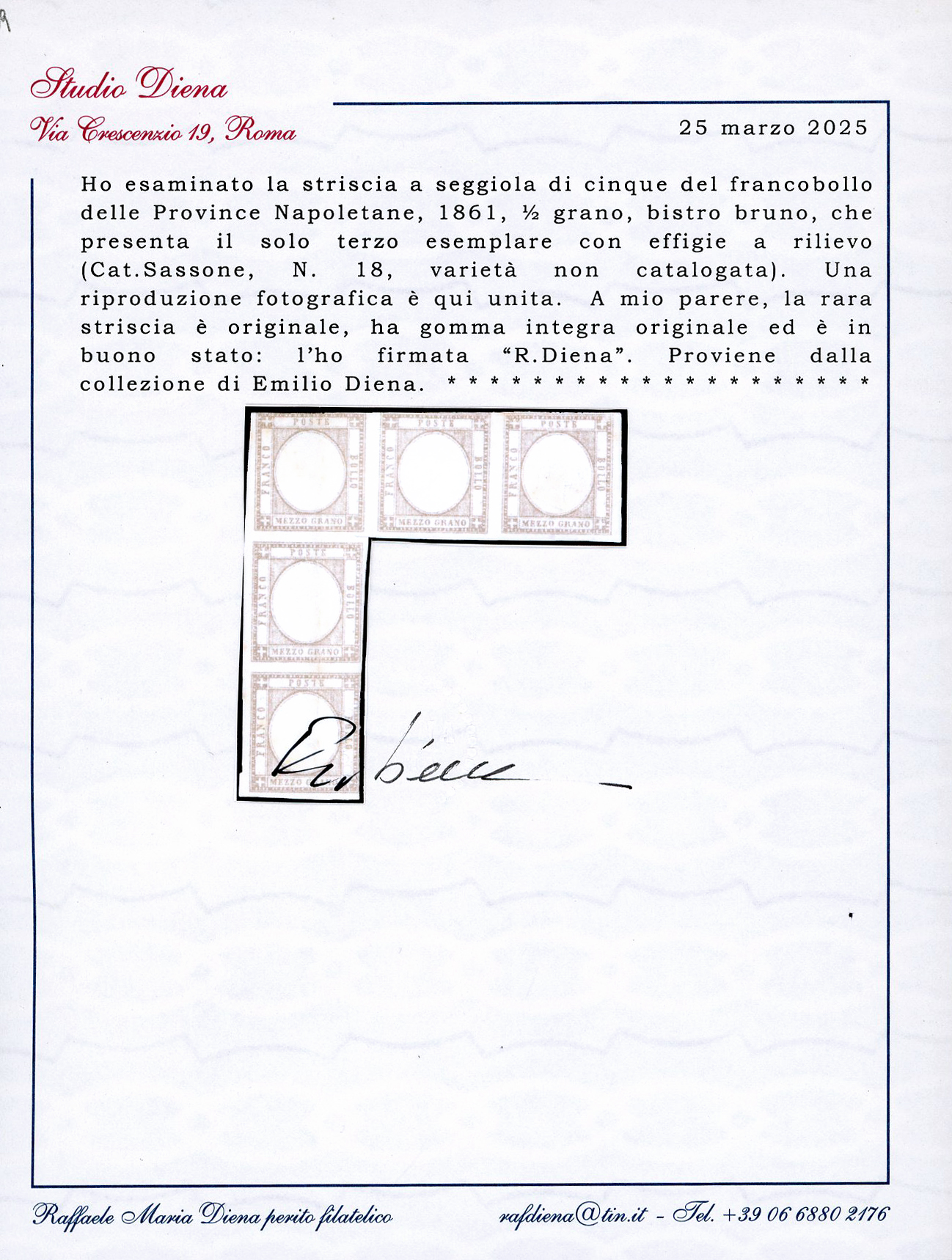 1861 - 1/2 grano bistro bruno (18), striscia di cinque a seggiola, un solo esemplare con effigie, quattro senza, nuova, gomma originale integra, alcune pieghe. Rarissimo insieme, inedito e non catalogato. Cert. Diena. Ex coll. Emilio Diena.