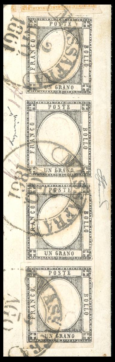 1861 - 1 grano grigio nero, striscia verticale di quattro, il primo esemplare praticamente senza il filetto esterno a destra e con parziale filetto di inquadratura in alto, gli altri esemplari con il filetto esterno a destra fortemente incompleto, 10 grana bistro (19a,22c), perfetti, su lettera assicurata da Massafra 2/8/1861 a Napoli. Varietà non catalogata, probabilmente unica nota e di ottima qualità. A.Diena, Chiavarello, cert. E.Diena e Ferrario. Ex coll. Imperato.