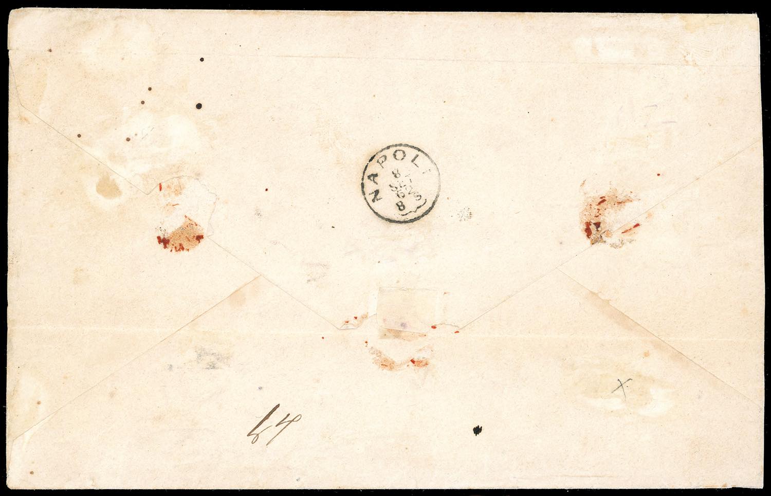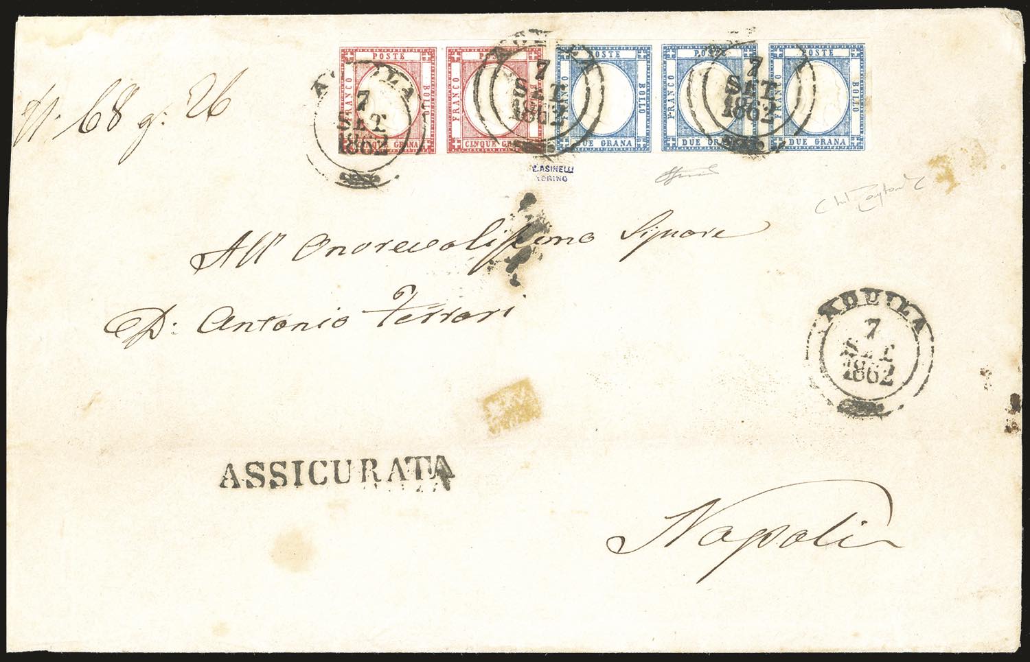 1862 - 2 grana azzurro, striscia di tre 5 grana rosso carminio, coppia (20b,21), margini da ampi a rasenti, su lettera assicurata da L'Aquila 7/9/1862 a Napoli. Rara affrancatura multipla, non catalogata. Raybaudi, Ferrario. Ex coll. Imperato.