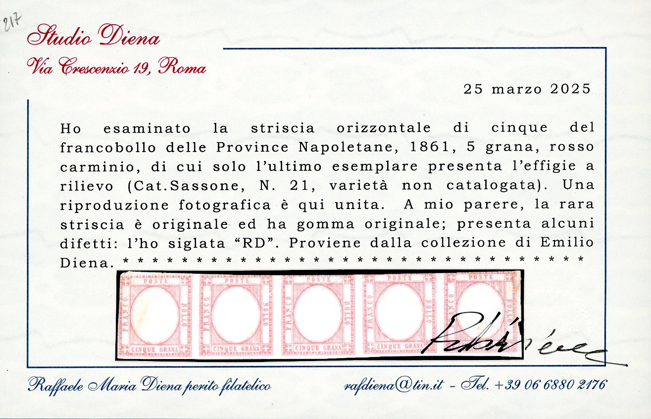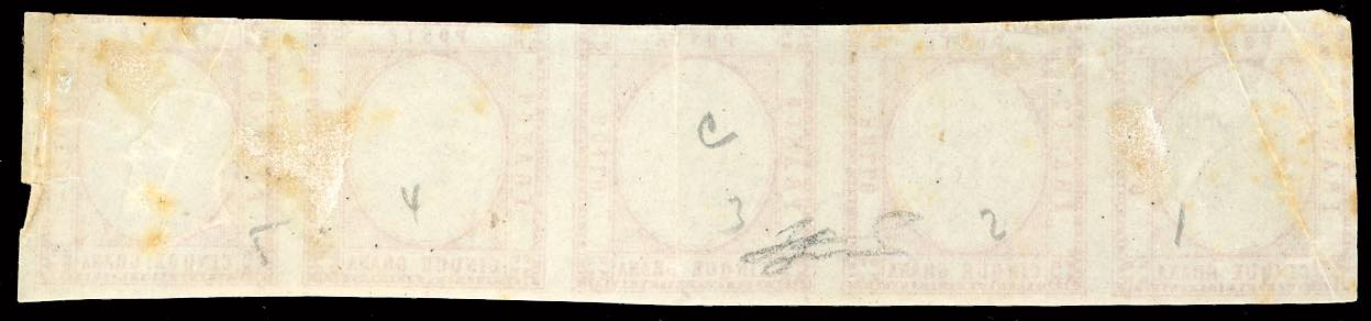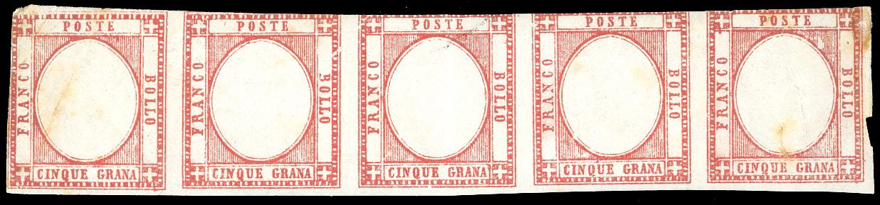 1861 - 5 grana rosso carminio (21), striscia orizzontale di cinque, solo l'ultimo esemplare con effigie, gli altri quattro senza, nuova, gomma originale, alcuni difetti. Rarissimo insieme, inedito e non catalogato. Cert. Diena. Ex coll. Emilio Diena.