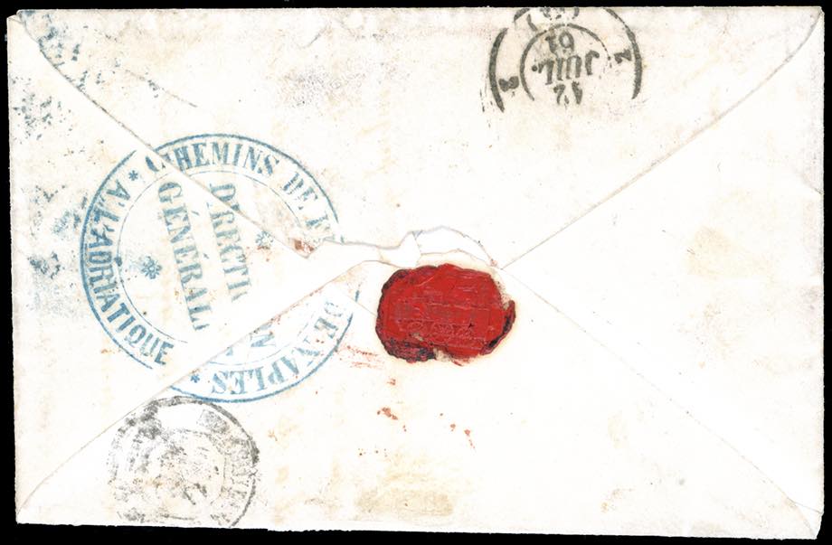 1861 - 20 grana giallo, 10 grana bistro, 5 grana rosso carminio (23,22,21), perfetti, su lettera da Napoli 11/7/1861 per Lione. Rara ... Leggi tutto