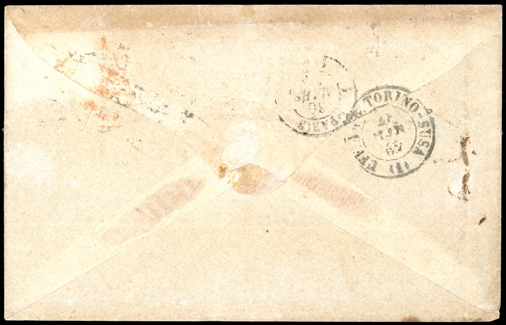 1862 - 20 grana arancio (23b), perfetto e ben marginato, su lettera di doppio porto da Napoli 25/3/1862 a Parigi. Raro uso isolato, ... Leggi tutto