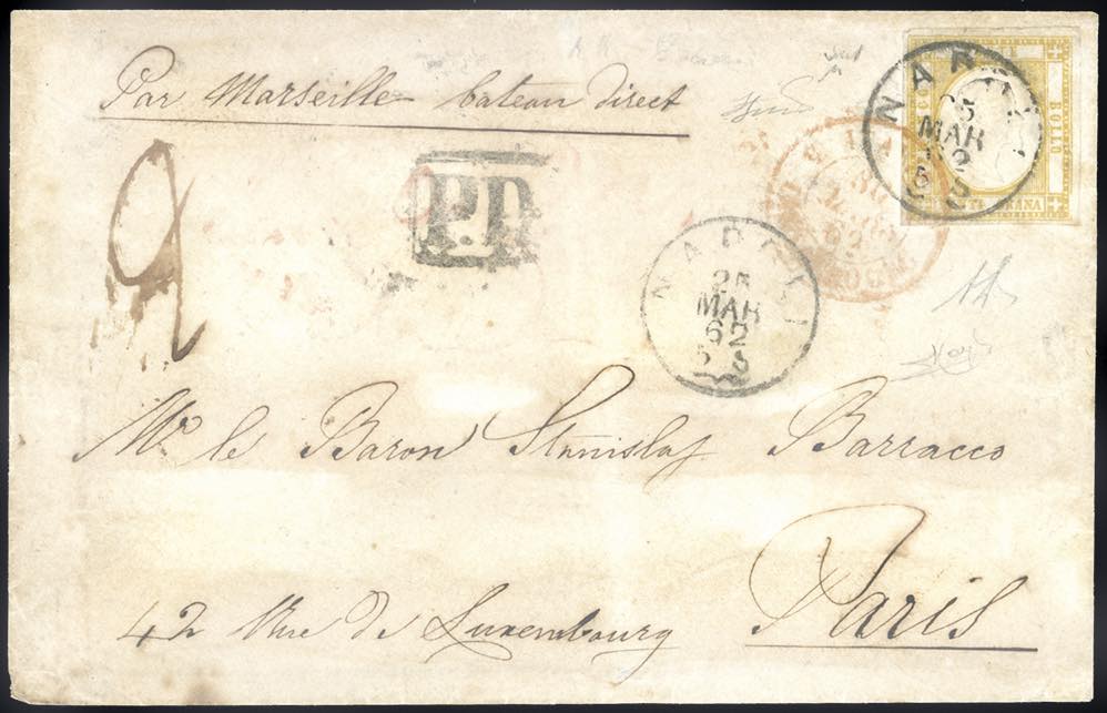 1862 - 20 grana arancio (23b), perfetto e ben marginato, su lettera di doppio porto da Napoli 25/3/1862 a Parigi. Raro uso isolato, impreziosito dalla pregevole tinta. A.Diena, Chiavarello, cert. Ferrario. Ex coll. Imperato.