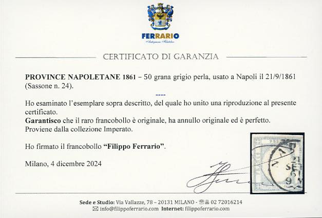 1861 - 50 grana grigio perla (24), perfetto, usato a Napoli 21/9/1861. Molto bello, raro di questa qualità. Emilio Diena, cert. Alberto ed Enzo Diena, Ferrario. Ex coll. Imperato.