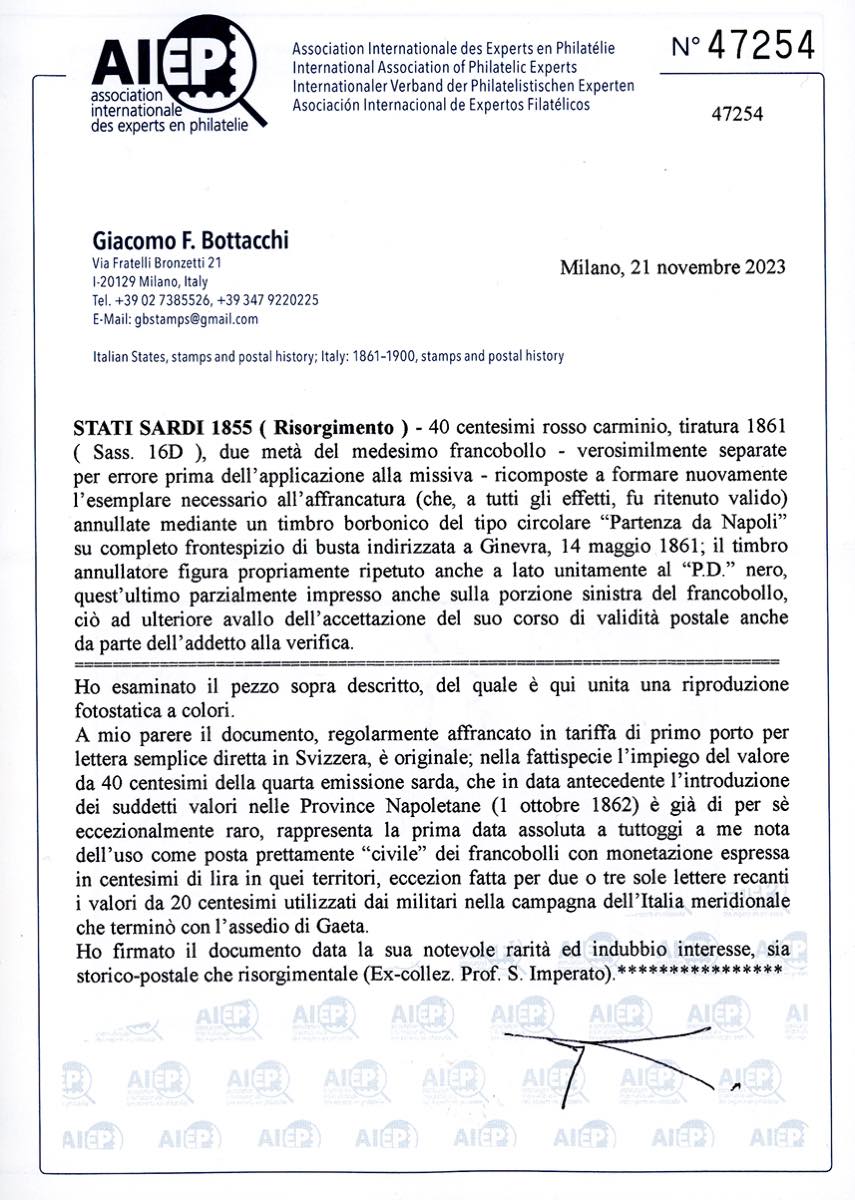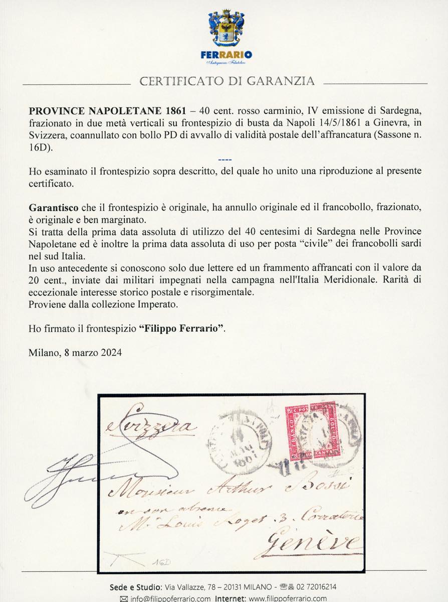 1861 - 40 cent. rosso carminio IV emissione di Sardegna (16D), francobollo frazionato in due metà verticali (verosimilmente separate per errore), ricomposte a formare nuovamente l'esemplare necessario per l'affrancatura, su frontespizio di lettera da Napoli 14/5/1861 a Ginevra, in Svizzera, bollo PD coannullatore, ad ulteriore avallo della validità postale dell'affrancatura. I francobolli della IV emissione di Sardegna vennero introdotti ufficialmente nelle Province Napoletane il 1° ottobre 1862. Si tratta della PRIMA DATA ASSOLUTA DI UTILIZZO DEL 40 CENTESIMI NELLE PROVINCE NAPOLETANE ed è inoltre la PRIMA DATA ASSOLUTA DI USO PER POSTA "CIVILE" DEI FRANCOBOLLI SARDI. In uso antecedente si conoscono solo due lettere ed un frammento affrancati con il valore da 20 cent., inviate dai militari impegnati nella campagna nell'Italia Meridionale. Rarità di eccezionale interesse storico postale e risorgimentale. A.Diena, Chiavarello, cert. Ferrario e dettagliato cert. AIEP Bottacchi. Ex coll. Imperato.