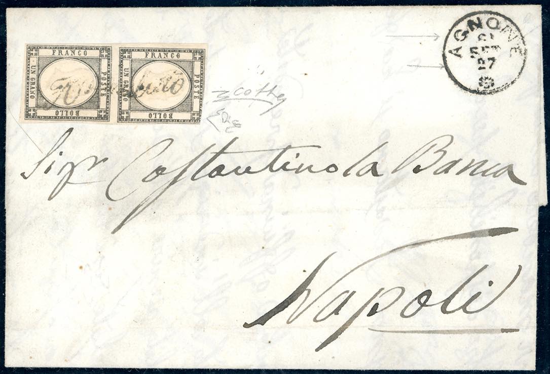 AGNONE, svolazzo + cerchio piccolo punti R2 - 1 grano (19), coppia, un esemplare leggermente intaccato in alto, su lettera del 27/9/1861 (datario invertito) per Napoli. Insieme unico. E.Diena, cert. Colla. Ex coll. Imperato.