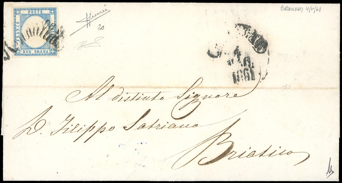 CATANZARO, svolazzo + cerchio punti 11 - 2 grana (20), perfetto, su lettera del 4/3/1861 per Briatico. Ferrario, cert. Sorani.