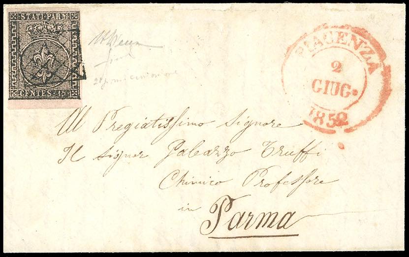 1852 - 15 cent. rosa (3), bordo di foglio in basso, perfetto, su fresca lettera da Piacenza 2/6/1852 a Parma, bollo di arrivo al verso del giorno successivo. Rara lettera risalente al secondo giorno d'emissione. A.Diena, Fiecchi.