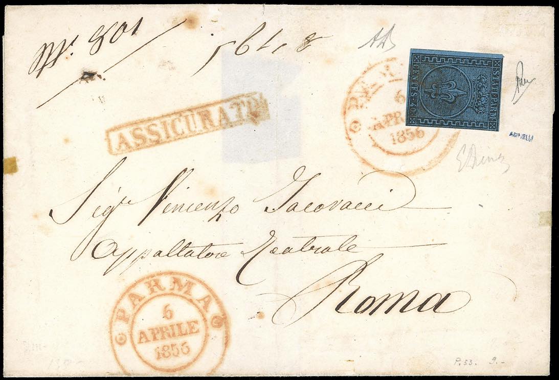 1856 - 40 cent. azzurro (5), a filo a destra, su busta raccomandata da Parma 6/4/1856 a Roma, datario e lineare in cartella "assicurato" in rosso. Malgrado sia stato asportato il francobollo al verso per il diritto si assicurazione, le assicurate verso lo Stato Pontificio sono estremamente rare. Emilio ed Alberto Diena.