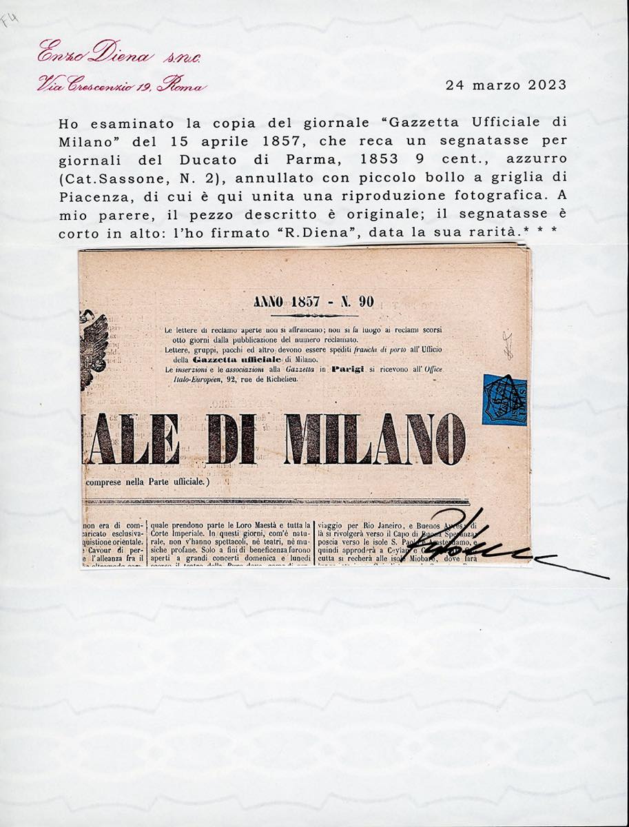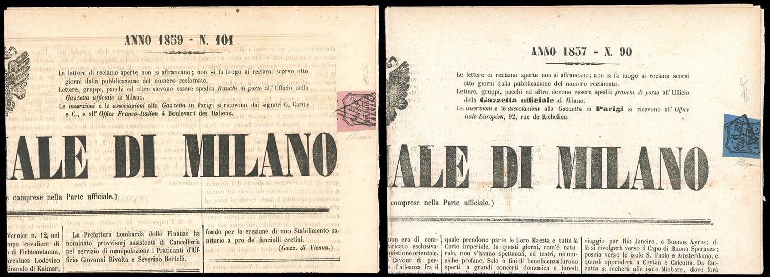 1857/59 - 6 cent. rosa vivo (1), corto in alto, usato con il bollo a losanga di Piacenza su "Gazzetta Ufficiale di Milano" del 28/4/1859; 9 cent. azzurro (2), corto in alto, usato con il bollo piccolo a griglia di Piacenza su "Gazzetta Ufficiale di Milano" del 15/4/1857. Entrambi molto freschi e rari. Occasione. Ferrario, cert. Diena.