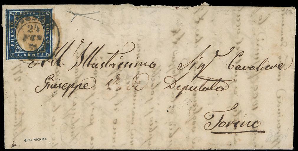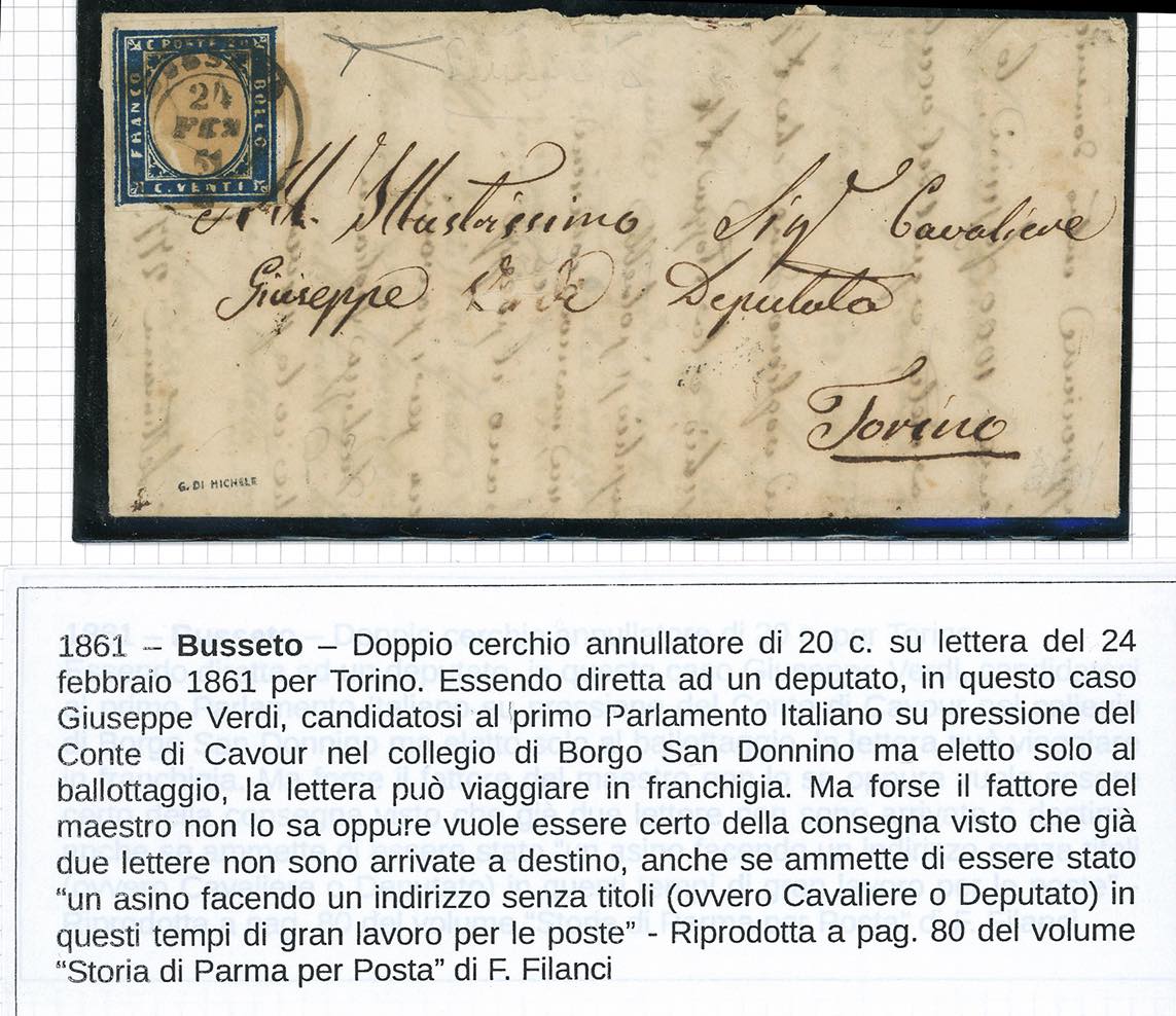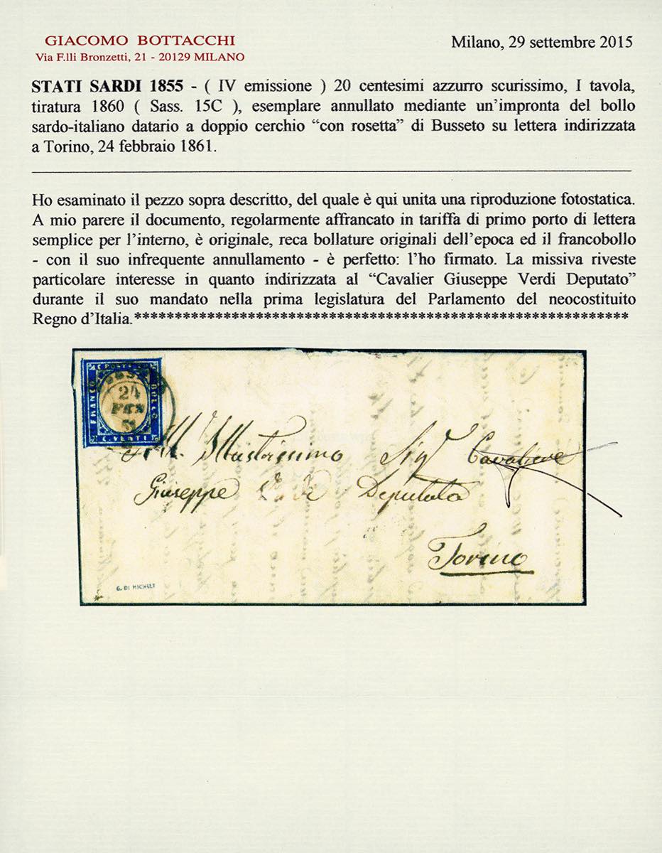 BUSSETO, sardo italiano punti 11 - 20 cent. IV emissione di Sardegna (15C),perfetto, su lettera del 24/2/1861 a Torino, indirizzata al "Cavalier Giuseppe Verdi Deputato" durante il suo mandato nella prima legislatura del Parlamento del neocostituito Regno d'Italia, con interessante testo interno. Per specialista. Cert. Bottacchi.