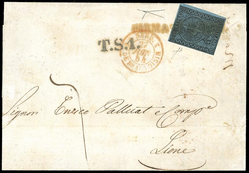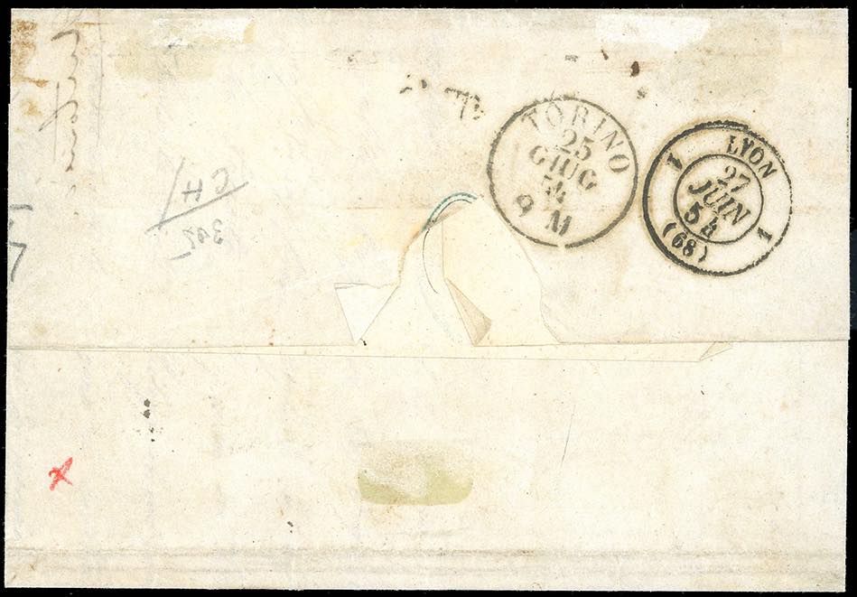 PARMA, lineare su una riga in rosso punti R2 - 40 cent. azzurro (5), perfetto, su lettera del 23/6/1854 per Lione, in Francia, tassata in ... Leggi tutto