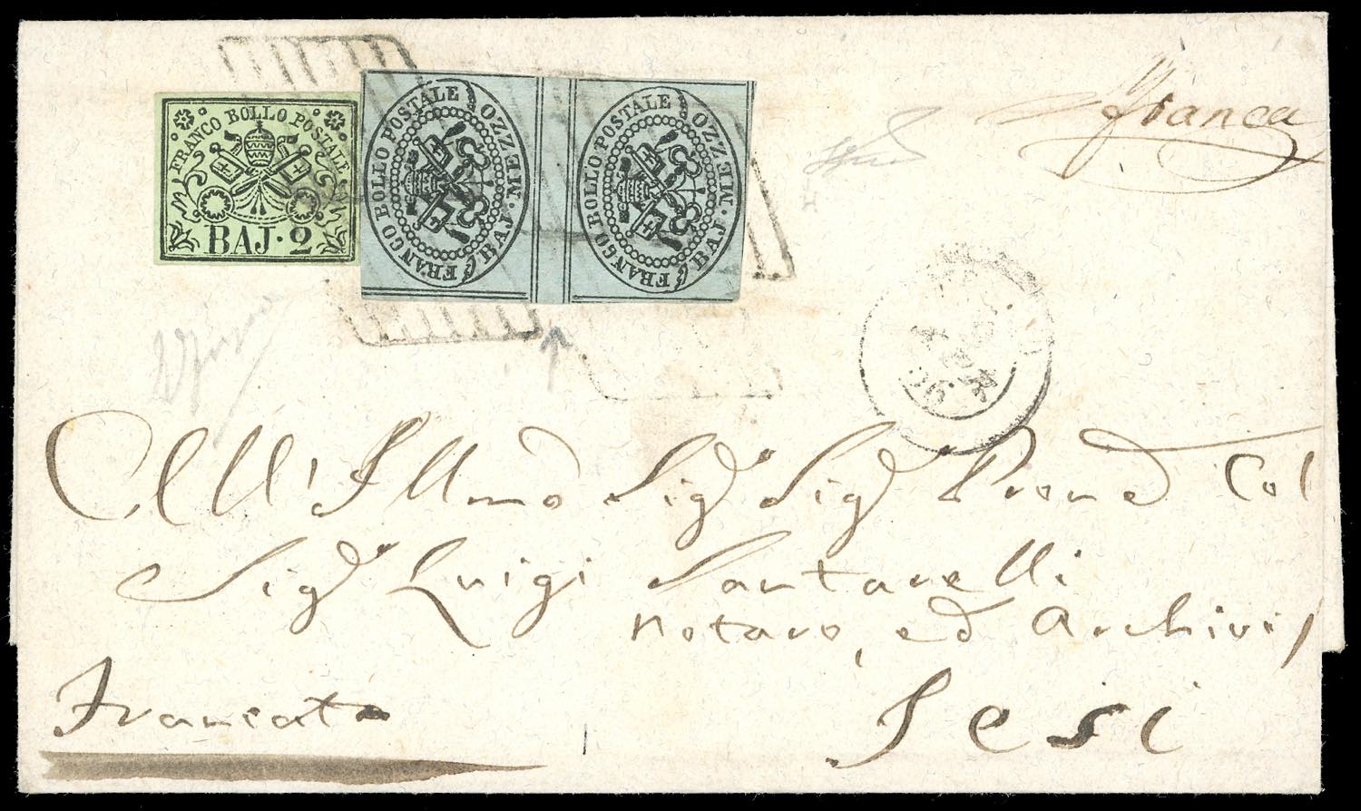 1856 - 1/2 baj grigio azzurro, coppia verticale con interspazio di gruppo al centro, 2 baj verde giallastro (1a,3a), perfetti, su lettera da Fermo 9/4/1856 a Jesi. Cert. Ferrario. Ex coll. Imperato.