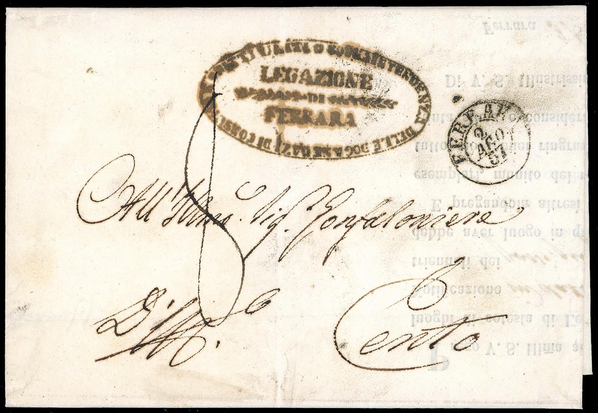 1857 - 1 baj verde grigiastro, 7 baj azzurro (2,8), ottimo stato, al verso di lettera in porto assegnato di otto porti da Ferrara 2/8/1857 a Cento, tassata 8 baj sul fronte. Rara alta tassazione. Bottacchi.