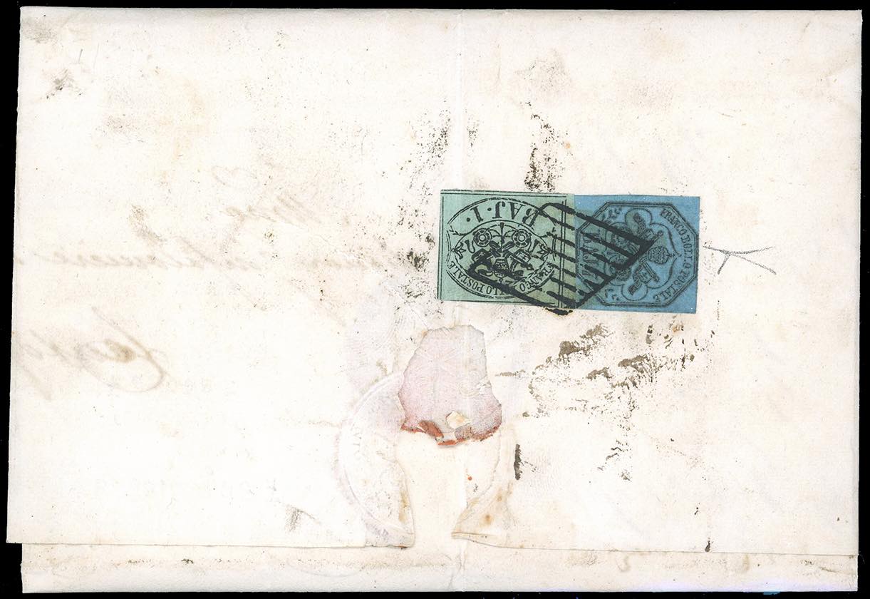 1857 - 1 baj verde grigiastro, 7 baj azzurro (2,8), ottimo stato, al verso di lettera in porto assegnato di otto porti da Ferrara 2/8/1857 ... Leggi tutto