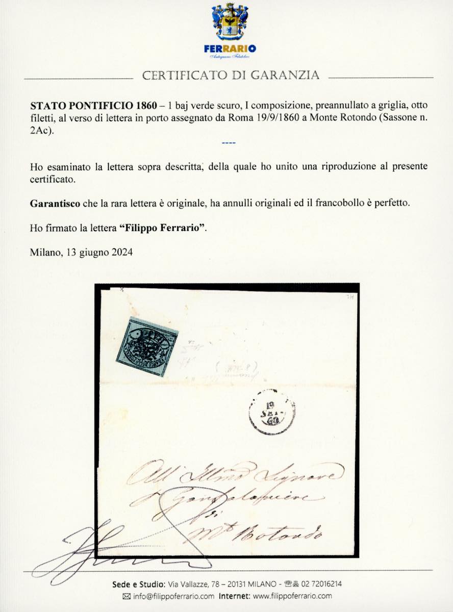 1860 - 1 baj verde scuro, I composizione, preannullato a griglia, otto filetti (2Ac), perfetto, al verso di lettera in porto assegnato da Roma 19/9/1860 a Monte Rotondo. Molto rara e di ottima qualità. A.Diena, cert. Ferrario.