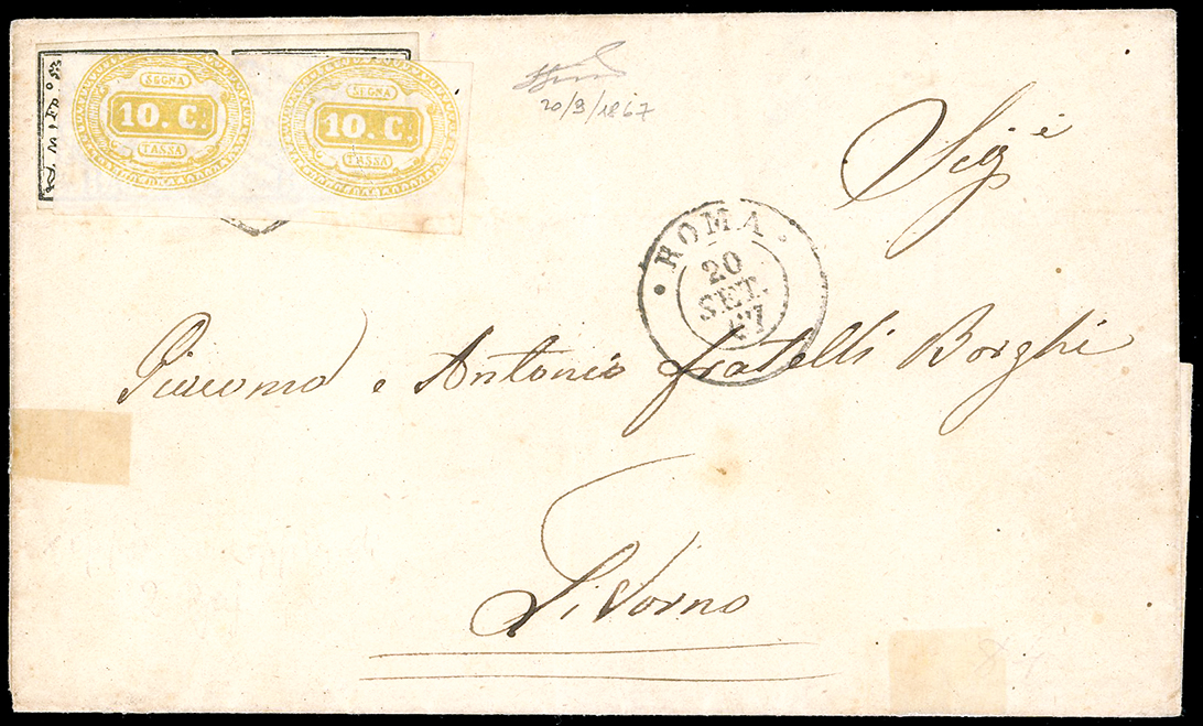 1867 - 2 baj bianco (3A), coppia orizzontale, perfetta, su lettera da Roma 20/9/1867, ULTIMO GIORNO D'USO UFFICIALE DELL'EMISSIONE IN BAJOCCHI, a Livorno, tassata in arrivo con una coppia del segnatasse da 10 cent. giallo (1), buono stato, non annullata come prassi. Rara data, specie su corrispondenze indirizzate al di fuori dello Stato Pontificio. Cert. Ferrario.