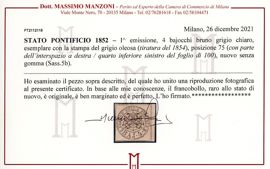 1854 - 4 baj bruno grigio chiaro, stampa con inchiostro grigio oleoso (5b), bordo di foglio, nuovo senza gomma, perfetto e con ottimi margini. Raro e di ottima qualità. Em.Diena e cert. Manzoni.