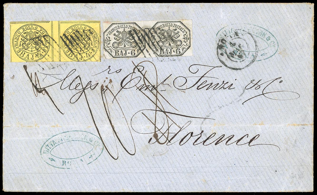 1867 - 4 baj giallo vivo, coppia orizzontale con interspazio di gruppo al centro, 6 baj grigio perla, coppia orizzontale (5Aa,7Aa), ottimo stato, su lettera di quinto porto da Roma 4/5/1867 a Firenze, tassata 1 lira. Molto rara. Cert. Bottacchi. Ex coll. Imperato.